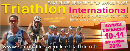 En septembre, l’édition 2016 du triathlon international de Saint-Gilles-Croix-de-Vie passera par l’esplanade et les abords de la Grande Plage, face au Grand bleu. Plus de 800 athlètes se disputeront le titre de champion, applaudis par quelque 5 000 spectateurs admiratifs de l’exploit de l’épreuve internationale : 1 500 mètres de natation, 40 km de vélo et 10 km de course à pied ! (illustration copyright: saintgillesvendeetriathlon.fr).